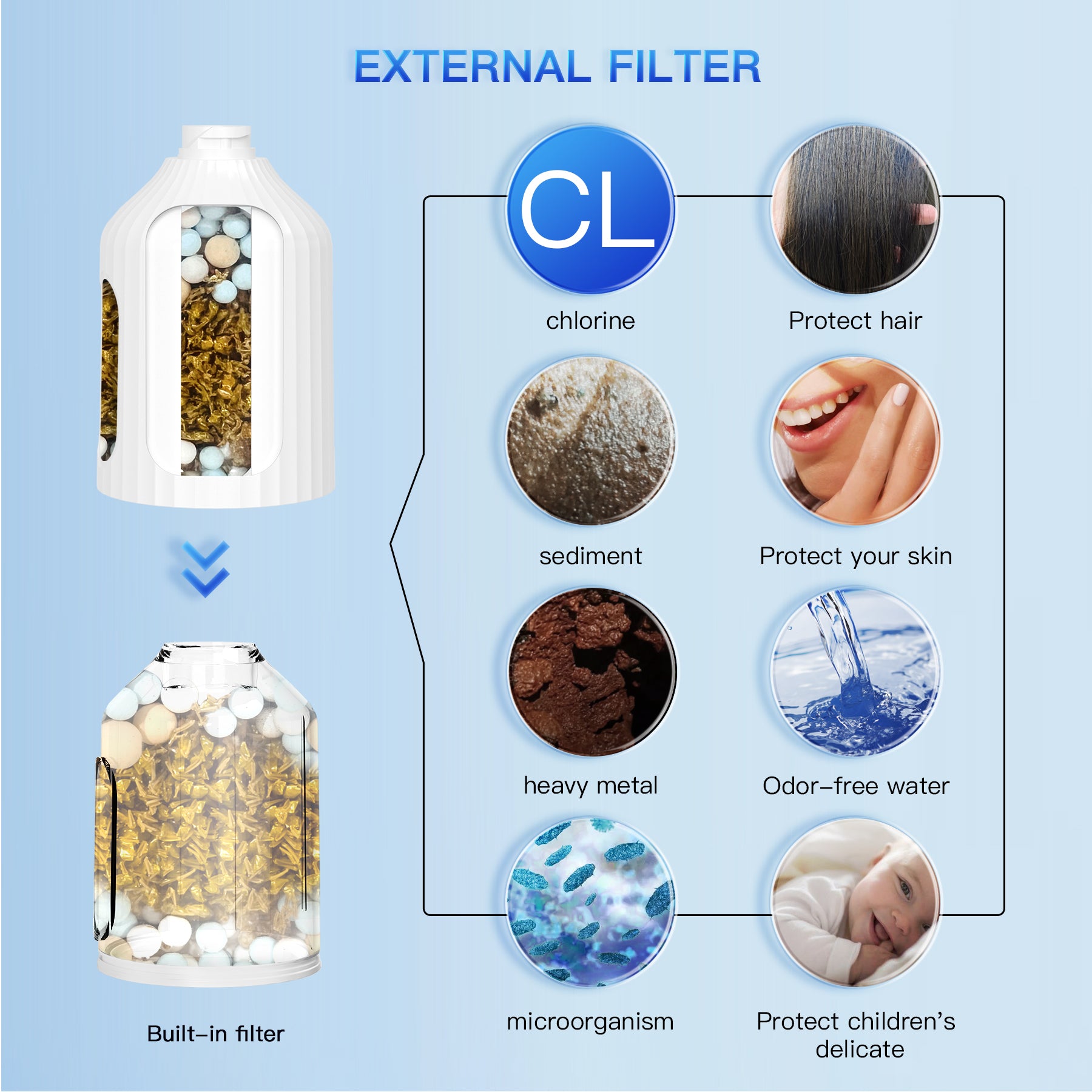 - External filter design: Unlike traditional filtered showerheads that require one built-in filter per head, the new external filter can be paired freely with any showerhead, even those without built-in filtration.